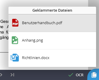 Sofern zum ausgewählten Dokument geklammerte Dateien vorliegen, wird eine zusätzliche Schaltfläche auf der rechten Seite der Fußzeile angeboten.